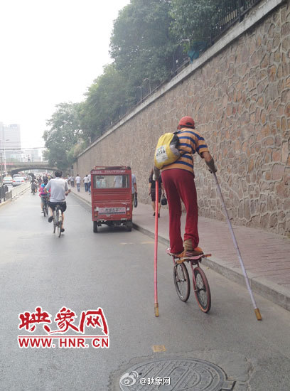 腳踩輪子,你以為就是哪吒?8月23日,鄭州中原路隧道西向東方向,一名約40多歲的背包男腳踏兩輪滑輪車,雙手各拿一根2米多長的滑桿,動作嫻熟地下坡上坡停車前行。市民感嘆:簡直像雜技,就是太危險。