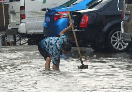 昨天下午,鄭州突降大雨??图悸分卸危?00多米道路被雨水淹沒(méi),積水最深處已經(jīng)到腿肚。一位大媽冒著暴雨在積水中清理下水口附近的垃圾,試圖讓水流得更快一些。