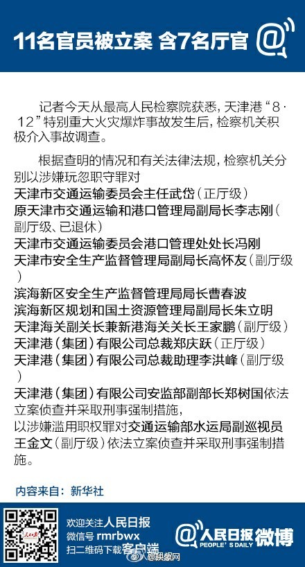 天津交通委主任武岱(正廳)、原天津交通運(yùn)輸和港口管理局副局長(zhǎng)李志剛(副廳、已退休)、天津安監(jiān)局副局長(zhǎng)高懷友(副廳)、天津海關(guān)副關(guān)長(zhǎng)王家鵬(副廳)、天津港集團(tuán)總裁鄭慶躍(正廳)、總裁助理李洪峰(副廳)、交通部水運(yùn)局副巡視員王金文(副廳)。