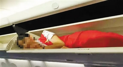 網傳多張圖片顯示有空乘人員躺在行李架上。網絡截圖