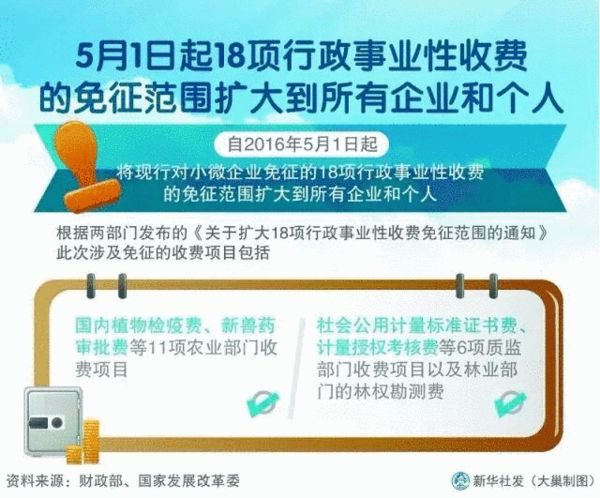 4月28日,財政部網(wǎng)站發(fā)布《關(guān)于擴(kuò)大18項行政事業(yè)性收費免征范圍的通知》:自5月1日起,擴(kuò)大18項行政事業(yè)性收費免征范圍。