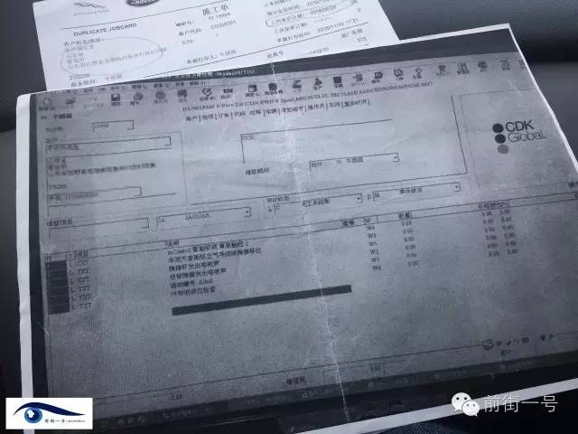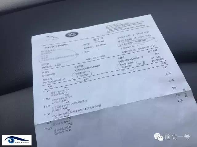 在客戶提供的“施工單”復(fù)印件上,前街一號(hào)記者看到上面記錄了陳先生的個(gè)人及所購(gòu)車(chē)輛詳細(xì)信息。在“描述”一欄中,記者看到了包括“橫撐桿發(fā)生咯吱聲”、“后彈簧發(fā)出咯吱聲”、“車(chē)頂天窗面板空氣倒流板彈簧移位”等六條記錄,且每條記錄后均有以“K”打頭的活動(dòng)編號(hào)。