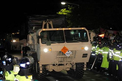 據韓國媒體報道,韓美聯軍當局于26日凌晨4時40分左右,將8輛裝有“薩德”裝備的卡車運抵“薩德”部署地——星州高爾夫球場。