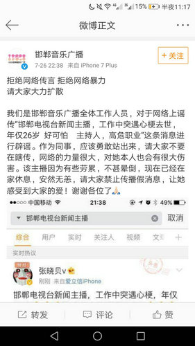 法制晚報(bào)·看法新聞?dòng)崳▽?shí)習(xí)記者 邱錦 實(shí)習(xí)生 王雯雯)今天,有網(wǎng)友發(fā)布了一條微博稱邯鄲電視臺(tái)一名女主播在工作中猝死,并配有女主播在主持活動(dòng)過程中突然倒下的視頻,經(jīng)多人轉(zhuǎn)發(fā)發(fā)酵,已廣泛傳播。