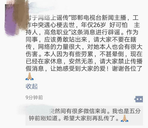 微博上暈倒的女主播為《邯鄲新聞》主播,在主持當(dāng)?shù)匾豁?xiàng)發(fā)布活動(dòng)時(shí)因勞累而暈倒在地,并被網(wǎng)友拍了視頻發(fā)在網(wǎng)上,稱其猝死。為此,彤彤特意發(fā)了一條朋友圈來辟謠,提醒大家不要傳謠以免給本人造成傷害。