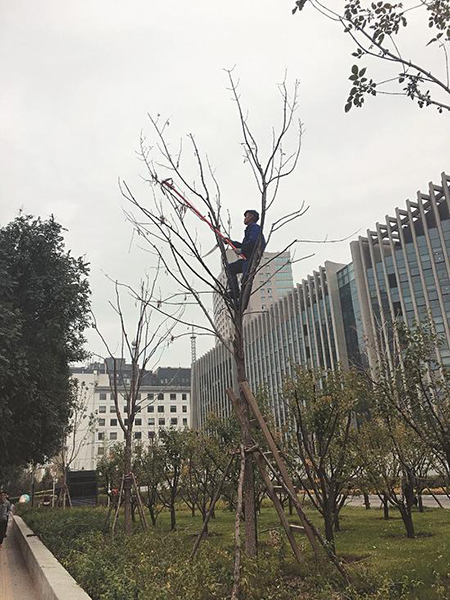 老段正在修剪的是一棵白蠟樹(shù),是今年新栽的,5米多高,樹(shù)冠比較大,樹(shù)枝的枝杈也很多,但是樹(shù)葉很少。“新栽的白蠟,樹(shù)葉還沒(méi)長(zhǎng),今年修剪完,明年就長(zhǎng)得好看了?!崩隙握f(shuō),新栽的樹(shù)一般都要在栽種處提前挖個(gè)土丘,可是因?yàn)楦当黄茐牧?,水分吸收得少,原先的?shù)枝多,營(yíng)養(yǎng)就不夠用。