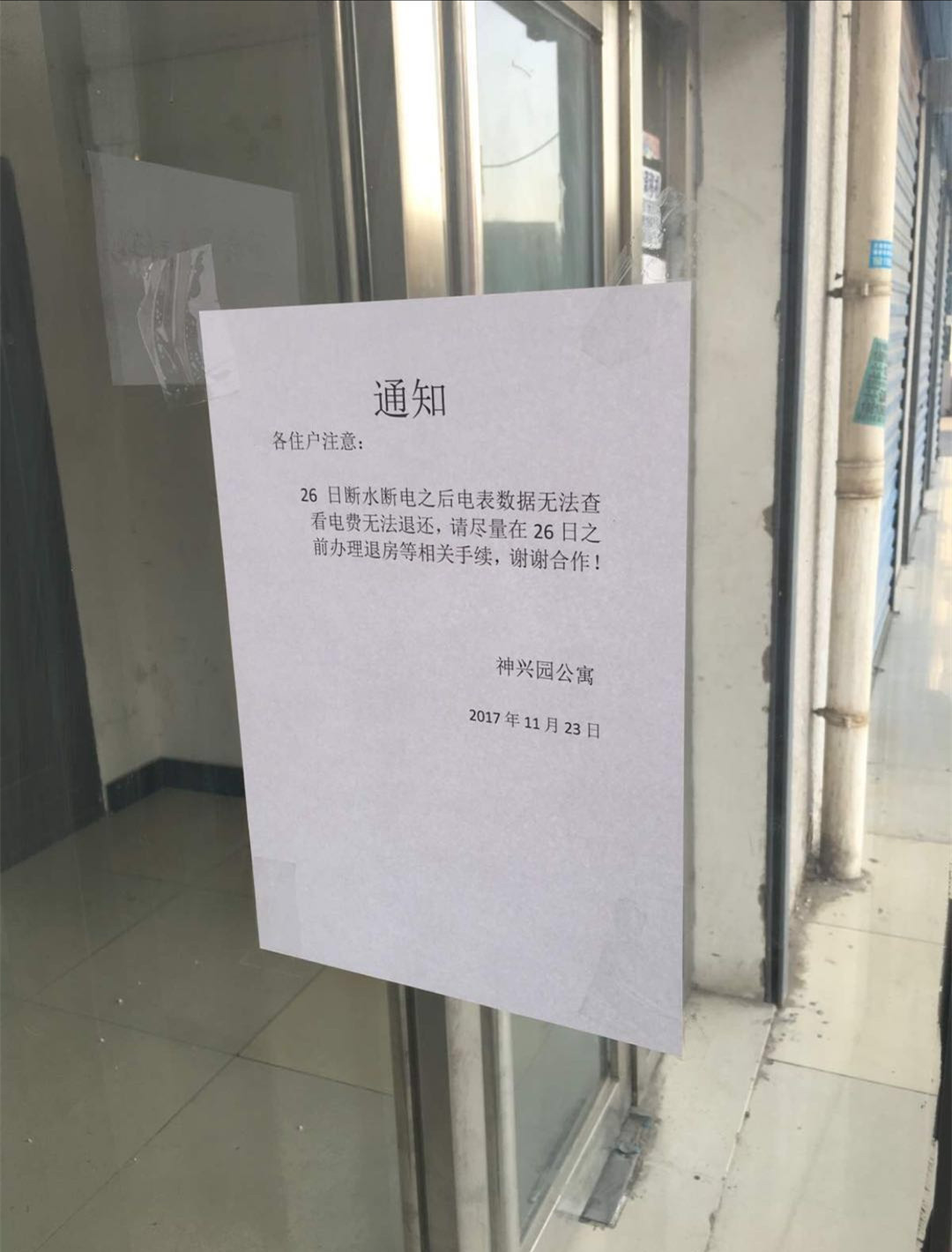 (根據(jù)通州臺湖鎮(zhèn)政府下發(fā)的通知,亦園青年創(chuàng)業(yè)園周邊5家公寓應(yīng)于11月26日全面停水停電,圖為5家公寓之一的神興園公寓的通知 饒賢君/攝)