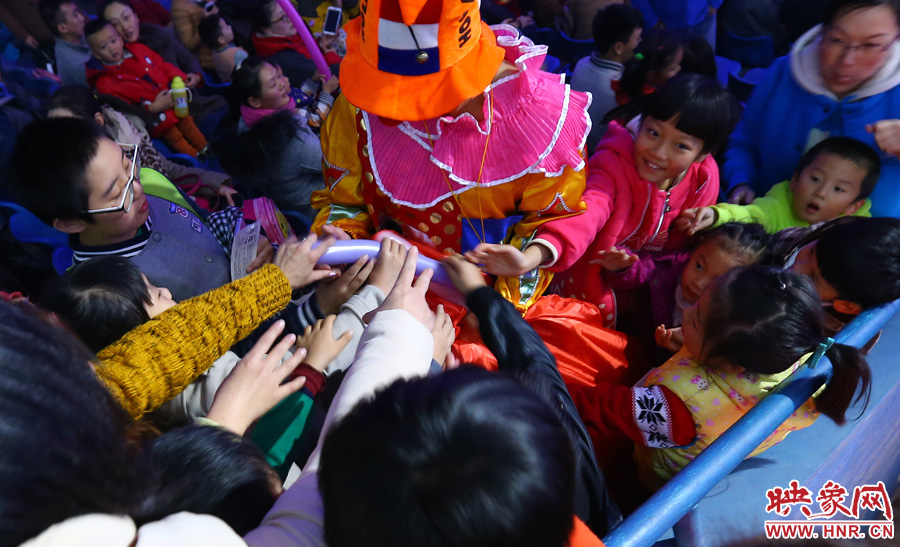 演出開始前,小丑在觀眾席為小朋友發(fā)禮物