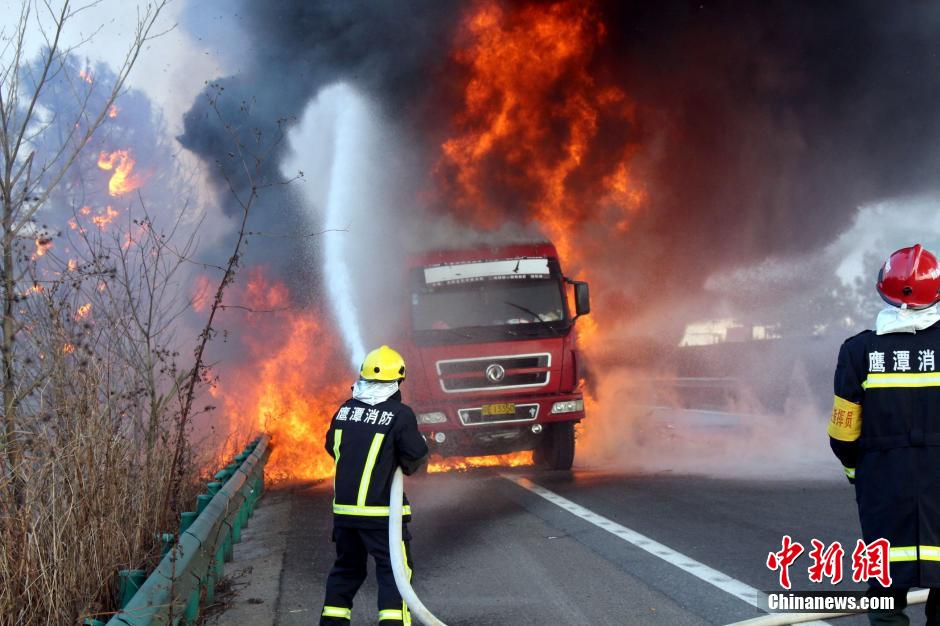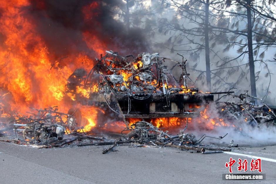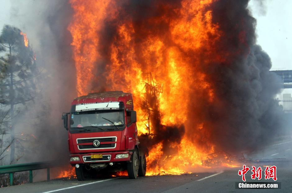 1月23日下午4時許,滬昆高速公路江西弋陽往貴溪方向593公樁(貴溪收費站附近)一輛載有133部電動車的半掛車起火,導致電動車被大火“吞噬”。江西貴溪消防官兵接警后迅速到場撲救,半小時后將大火撲滅。據(jù)司機稱,火災疑因高速護坡雜草叢起火產(chǎn)生的火芯飄至半掛車,引燃包裝電動車的紙殼箱所致。中新社發(fā) 龔武 攝