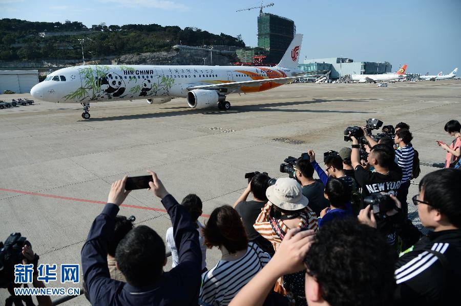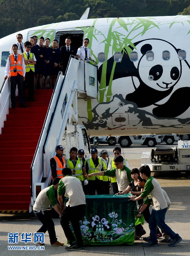 4月30日,大熊貓抵達澳門機場。當日16時許,中央政府贈送澳門的新一對大熊貓運抵澳門,澳門特區(qū)政府行政法務(wù)司司長陳海帆等官員及部分少年兒童在機場迎接。大熊貓經(jīng)檢疫人員檢查后在運輸籠中向前來接機的人們短暫亮相。目前它們身體狀況良好,隨后將前往金像農(nóng)場進行30天隔離檢疫。新華社記者張金加攝