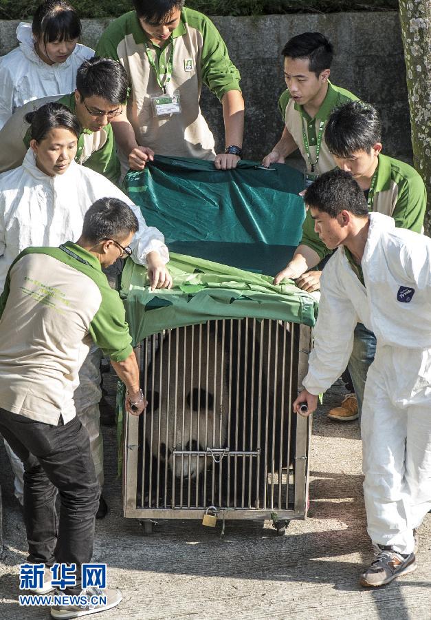 4月30日,工作人員將大熊貓運送到澳門路環(huán)金像農(nóng)場的隔離設(shè)施地點。當日16時許,中央政府贈送澳門的新一對大熊貓運抵澳門,澳門特區(qū)政府行政法務(wù)司司長陳海帆等官員及部分少年兒童在機場迎接。大熊貓經(jīng)檢疫人員檢查后在運輸籠中向前來接機的人們短暫亮相。目前它們身體狀況良好,隨后將前往金像農(nóng)場進行30天隔離檢疫。新華社記者張金加攝