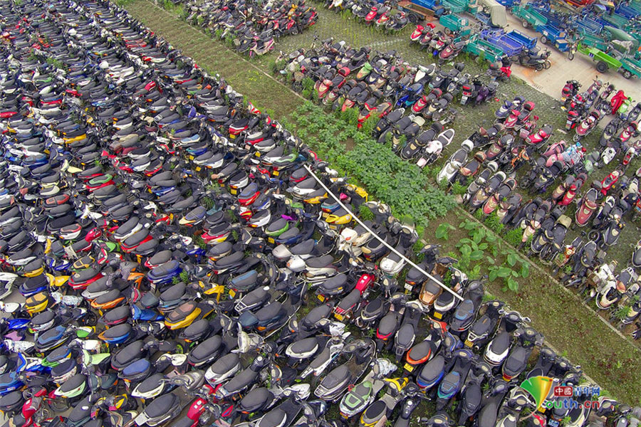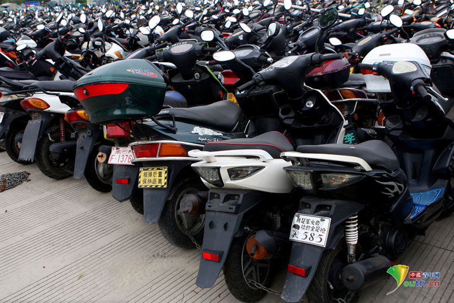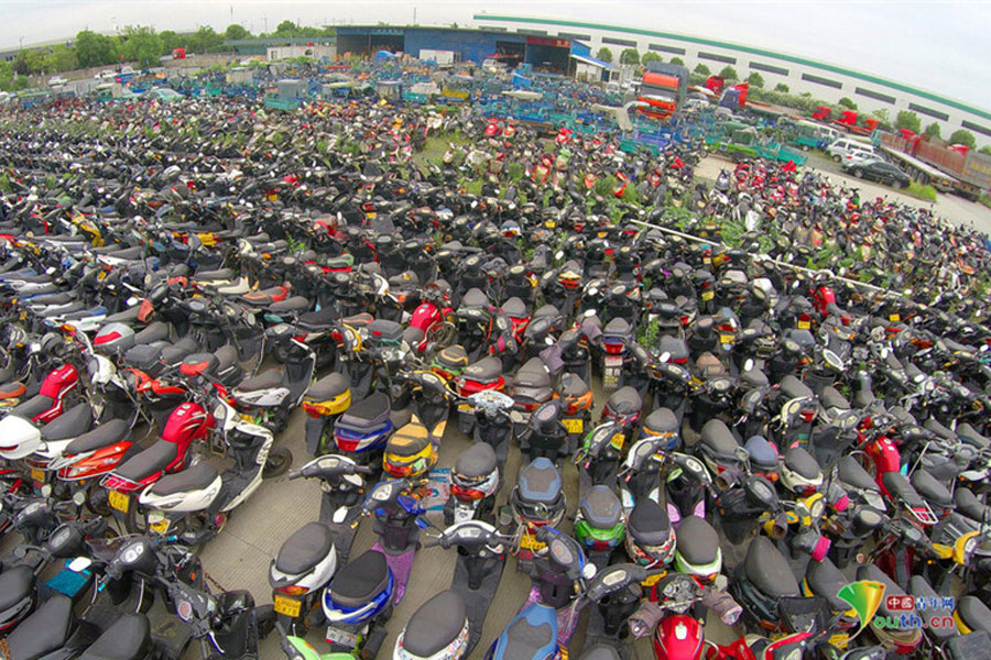 2015年6月4日,超寬、超速、非法營(yíng)運(yùn)三輪電摩及各種摩托車密密麻麻重重疊疊地堆積在一起,從高空中俯瞰場(chǎng)面震撼。這不只是杭州一家報(bào)廢車停車場(chǎng)的情景,幾乎每家停車場(chǎng)都如此。工作人員說(shuō),這都是交警執(zhí)法過(guò)程中收繳的。工作人員跟記者抱怨說(shuō),電摩停放時(shí)間太長(zhǎng),再不拆解都停不下了!據(jù)負(fù)責(zé)人介紹,杭州自禁摩托車以來(lái),總有一些違規(guī)者偷偷地利用摩托車充當(dāng)黑摩的。此舉既不安全,也暗藏各種不安全因素。2014年,杭州有204人死于涉及電瓶車的交通事故;在所有交通事故中,涉及電瓶車的占到四成以上。3月25日,有杭州媒體報(bào)道,杭州收繳的電動(dòng)車已堆滿停車場(chǎng),據(jù)估算馬路上還有百萬(wàn)輛以上超標(biāo)車。(金童子/攝)