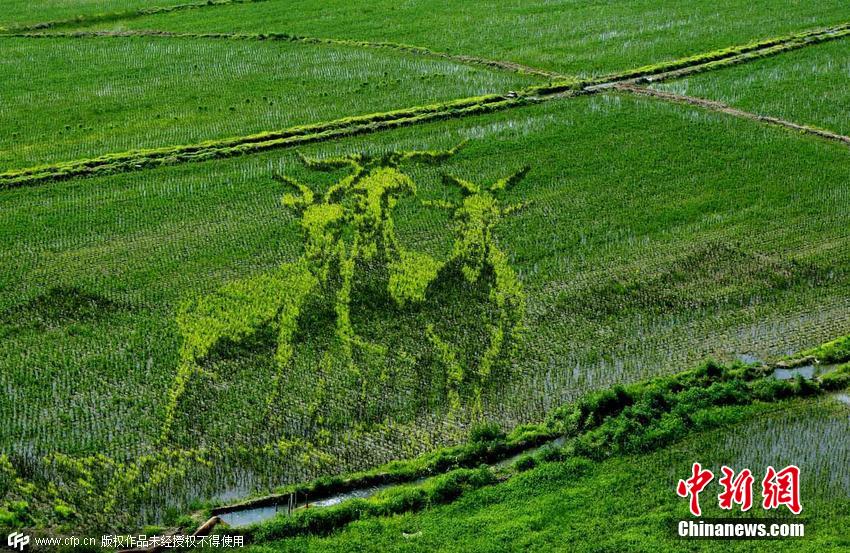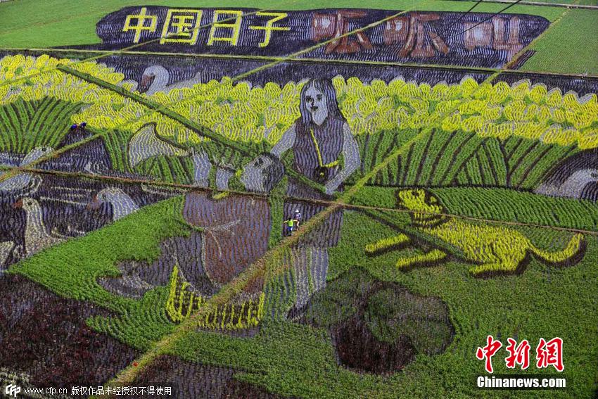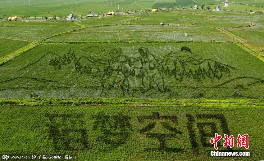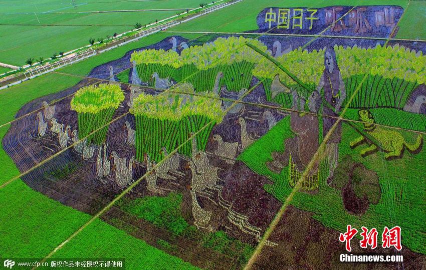 2015年6月22日,遼寧省沈陽市,總占地面積150畝的巨幅稻田畫《中國日子 呱呱叫》、《中國夢 幸福起航》、《小夢露》等十三幅“3D稻田畫”正式亮相沈陽沈北新區(qū)興隆臺錫伯族鎮(zhèn)。據了解,錫伯族有種植稻田畫祈福的傳統(tǒng),稻田畫先設計好要表現(xiàn)的圖形,利用先進的3D技術和透視技術,用矢量法定點定樁連線人工填色,種植不同品種有著不同顏色葉子的水稻,繪制出平面,立體,嘍空,線條四種不同風格稻田畫。田衛(wèi)濤 攝 圖片來源:CFP視覺中國