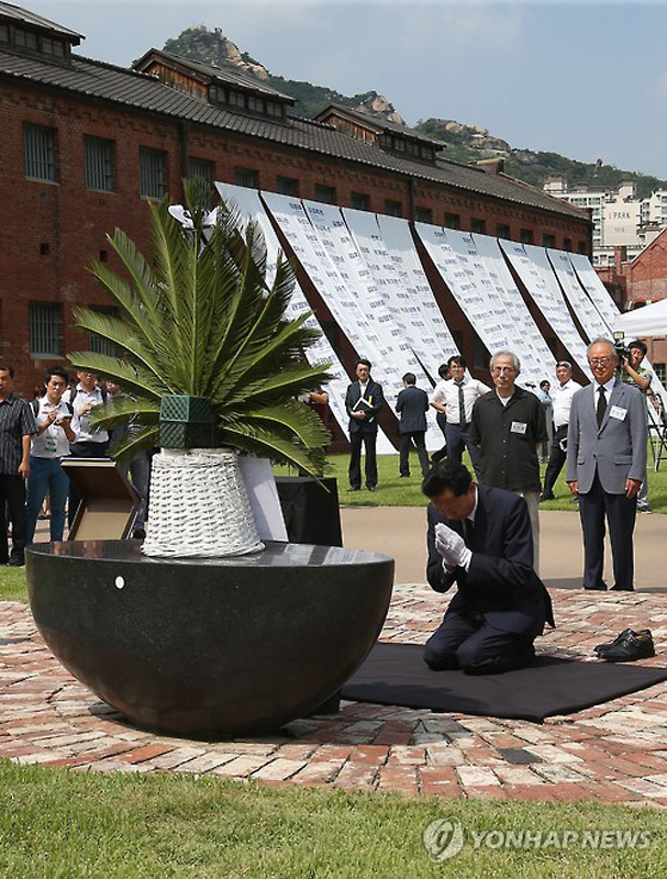 當(dāng)?shù)貢r(shí)間2015年8月12日,正在韓國(guó)訪問的日本前首相鳩山由紀(jì)夫參觀了首爾“西大門刑務(wù)所”博物館,并在追悼碑前跪地禱告。據(jù)悉,西大門刑務(wù)所始建于1908年,用于關(guān)押反抗日本殖民統(tǒng)治的韓國(guó)抗日義士。鳩山由紀(jì)夫表示,日本理應(yīng)承認(rèn)殖民侵略歷史。(圖片來源:網(wǎng)絡(luò))