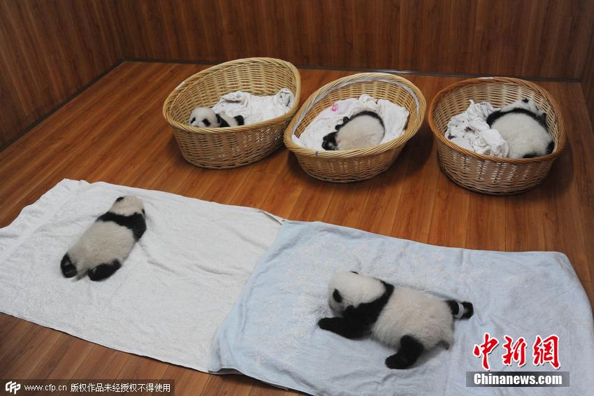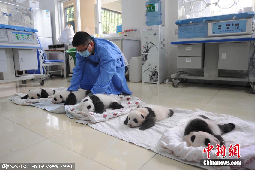 工作人員對(duì)熊貓寶寶逐個(gè)做檢查。截止目前,研究中心共繁育大熊貓14胎21仔,成活20仔,目前尚有待產(chǎn)大熊貓,有望打破新的繁育記錄。 圖片來(lái)源:CFP視覺(jué)中國(guó)