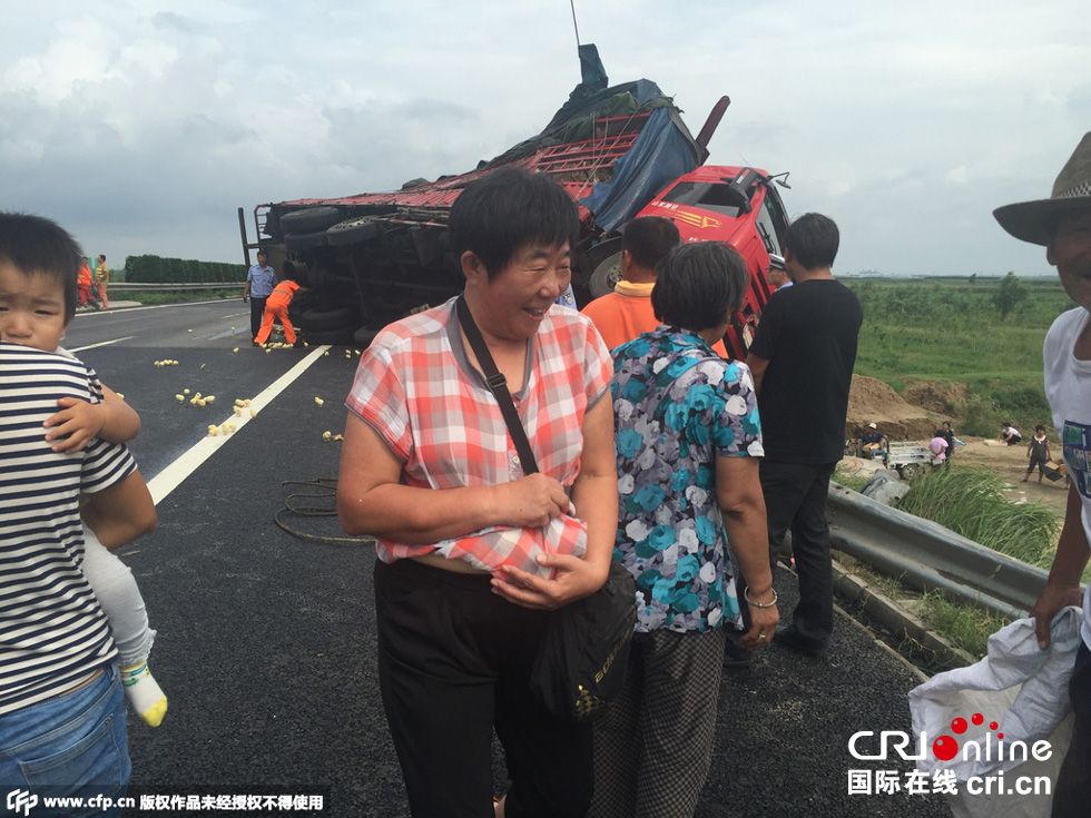 山東榮烏高速濱州沾化區(qū)段,一輛山東禽類運(yùn)輸車傾翻,數(shù)萬只小黃雞散落在地,附近村民聞訊,紛紛前來抓小雞。圖片來源:CFP