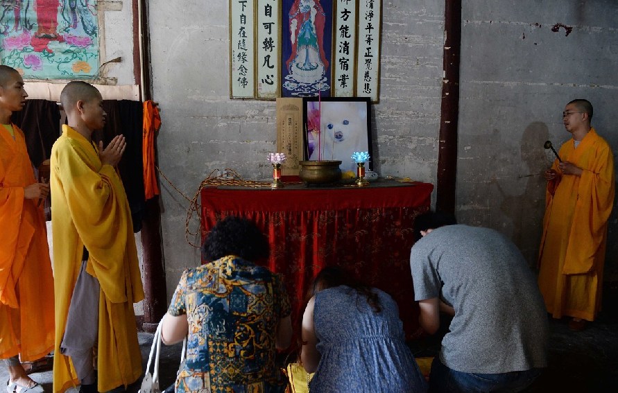 周近夏認(rèn)為,自己的服務(wù)理念賣的是火化之外的事情,追悼?jī)x式就是其中之一。從2011年成立釋友寵物殯葬至今,不少名人通過(guò)口口相傳找到周近夏的店為自己的寵物處理后事。圖為寵物狗的遺像被擺放在寺廟中。