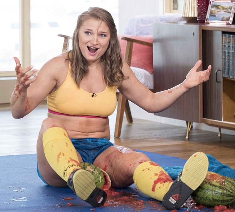 拉斯楚克首先放好3個(gè)大西瓜,在主持人的驚呼聲中,拉斯楚克輕松地夾碎了一個(gè)又一個(gè)西瓜。當(dāng)最后一個(gè)西瓜被夾碎后,拉斯楚克表情痛苦地坐在地上,兩位主持人都發(fā)出尖叫。