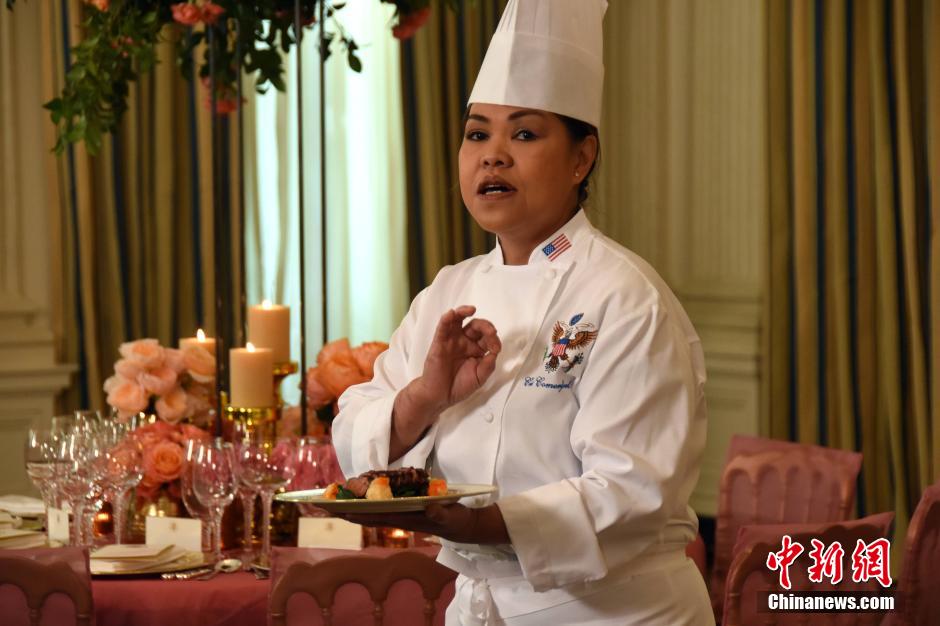 白宮首席甜點師莫里森展示為此次國宴準備的甜點。 中新社記者 刁海洋攝