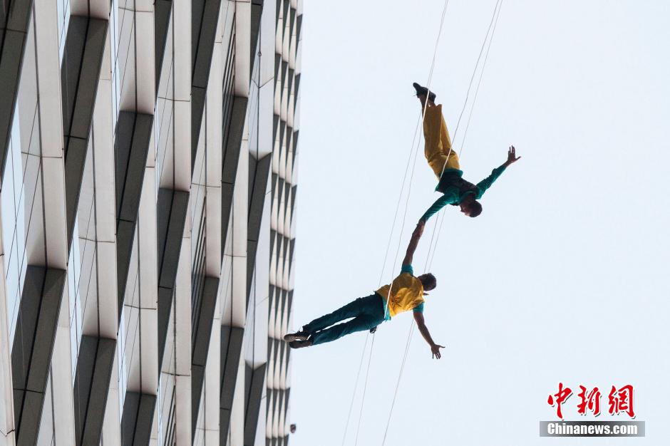 10月15日,美國BANDALOOP高空舞蹈團(tuán)“空中芭蕾”中國內(nèi)地首秀空降上海街頭,4名高空舞者在80米高的玻璃幕墻上翩翩起舞,舞蹈之美和力量之美在云端融合。中新社記者 張亨偉 攝