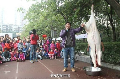 12月24日下午,重慶玉帶山小學(xué)舉行“民俗文化代代傳 傳統(tǒng)文化進(jìn)校園”活動(dòng)。學(xué)校從鄉(xiāng)下買(mǎi)回兩頭年豬,請(qǐng)來(lái)村民講述年豬習(xí)俗,殺豬匠殺豬后,科學(xué)老師為學(xué)生講解年豬身體結(jié)構(gòu)。