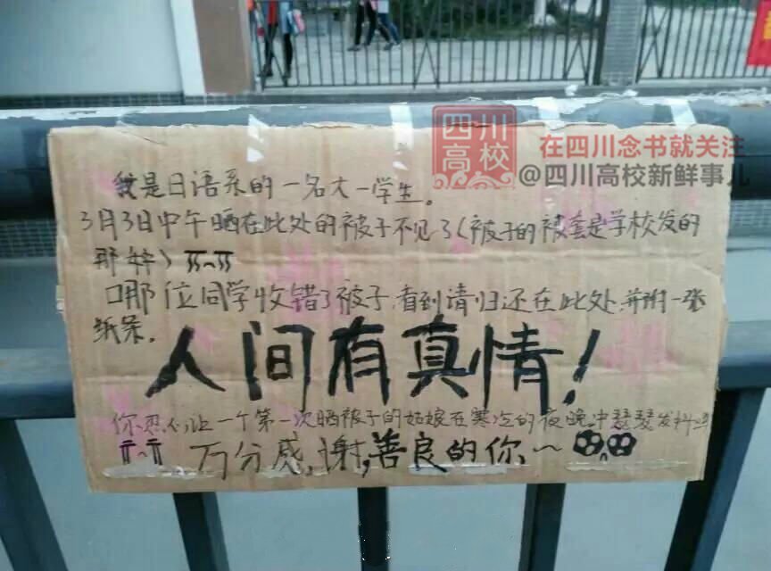 近日,四川外國語大學(xué)成都學(xué)院一女生在校內(nèi)曬的被子被其他同學(xué)誤拿,這位女生通過“人間有真情”海報(bào)、一系列“請往右看”便簽來定位一床沒人收的被子,以此尋找拿錯(cuò)被子的同學(xué)。這個(gè)萌辦法讓網(wǎng)友紛紛點(diǎn)贊。
