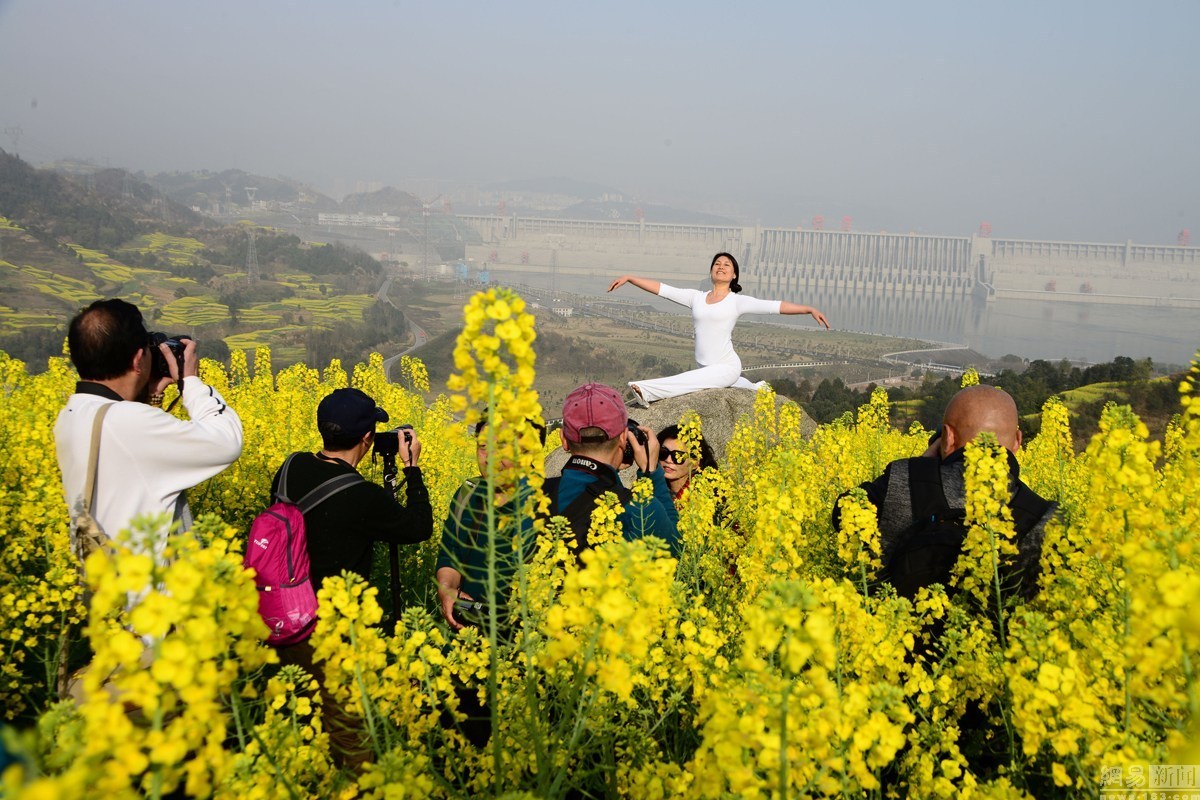 2016年3月6日,湖北宜昌,隨著春季氣溫的回升,湖北宜昌三峽壩區(qū)高家溪油菜花絢麗綻放,把三峽大壩映襯得分外壯觀美麗,吸引了眾多攝影發(fā)燒友和游人前來踏青采風游覽。當天一位練瑜伽的大媽陶醉于壩前花海,秀起了瑜伽,一時吸引了攝影發(fā)燒友和游人瘋狂拍攝。圖為大媽花海中秀瑜伽。