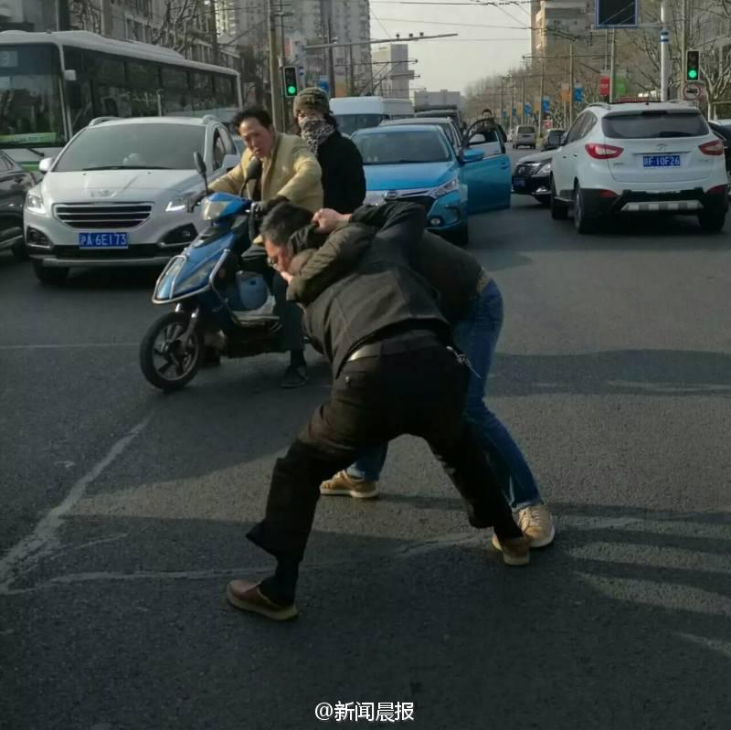 晨報訊 你一個過肩摔,我一個橫掃腿,接著扭打在一起,互相纏斗難分伯仲……這幕刺激的武打動作場景,昨天早高峰時在上海安波路營口路上演,而沖突竟源于“路怒”!目擊者肖先生告訴記者,昨天上午8點不到,他經(jīng)過安波路、營口路路口時,看看兩名男子扭打在一起,場面十分激烈。“我順勢拿出手機拍了幾張照片,旁邊也有行人上去勸架?!毙は壬f,在兩名男子的身旁,一橫一豎停著兩輛轎車,“我想可能是兩個人開車有點摩擦引起的‘路怒’吧。”