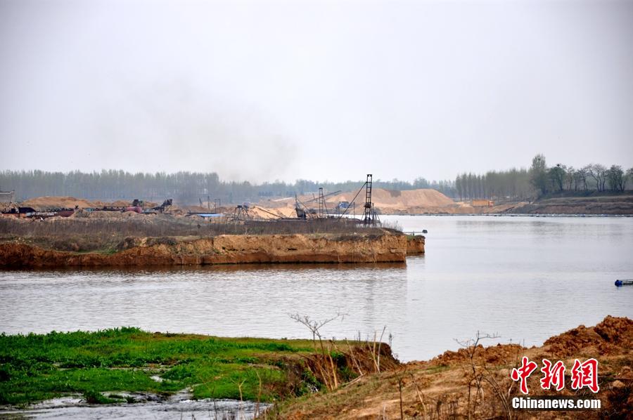 記者注意到,此處河道寬闊,靠近東側(cè)一邊有二三十米長的河道呈現(xiàn)出斷崖式塌陷,并由此形成3米左右的落差。河水順斷崖而下,呈現(xiàn)出頗為壯觀的瀑布景像。在瀑布下方一臺(tái)大型抽沙船正在進(jìn)行抽沙作業(yè)。河岸邊則是如小山包一樣的沙堆。