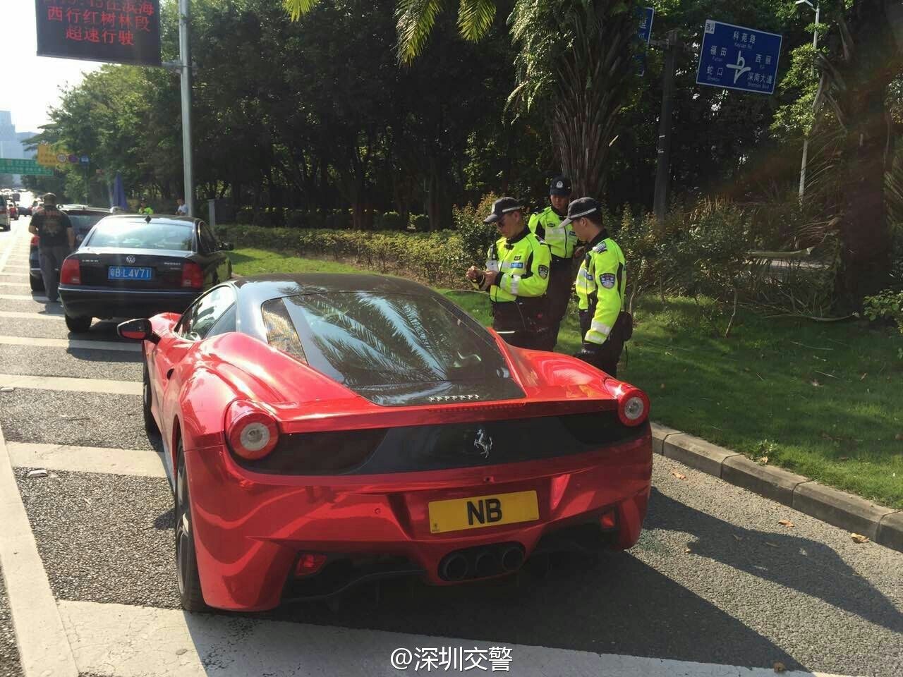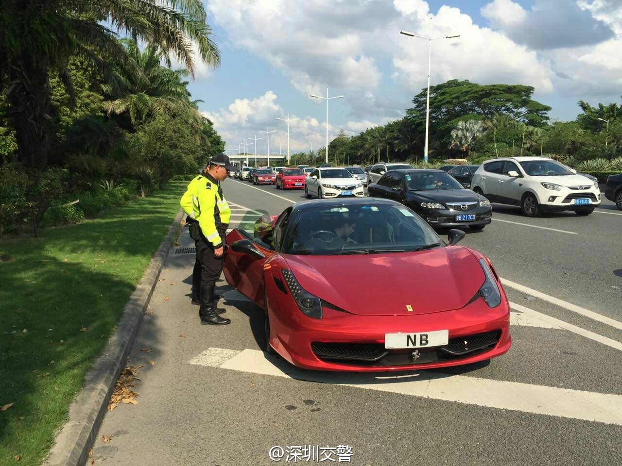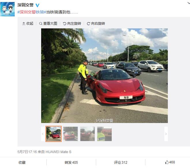 深圳交警5月7日17:16發(fā)布了一條微博:“當(dāng)鐵騎遇到他……”,同時(shí)配上四張圖片:只見一輛掛著“NB”車牌的紅色跑車被交警鐵騎攔下,最后被帶走。