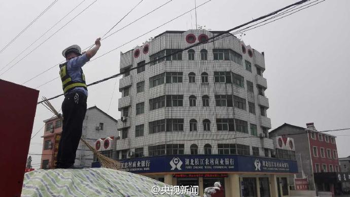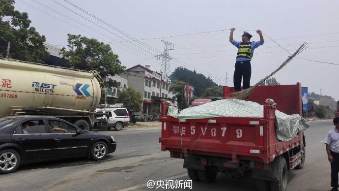 近日,在湖北宜昌一路段,電信光纜被風(fēng)刮斷,導(dǎo)致道路擁堵。交警董金橋?qū)⒐饫|奮力托起,留出空間保障車輛通行。一個(gè)多小時(shí)后,電信工作人員趕到搶修,直到線纜復(fù)位,董金橋才放下手臂休息。 央視記者 魏軼 圖片來(lái)源:央視新聞官方微博