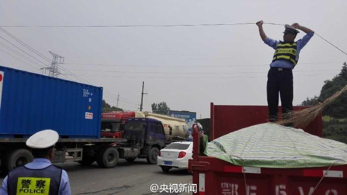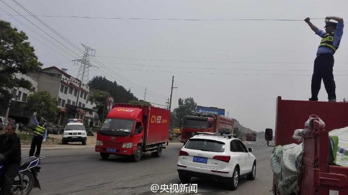 交警董金橋手托線纜。 央視記者 魏軼 圖片來(lái)源:央視新聞官方微博