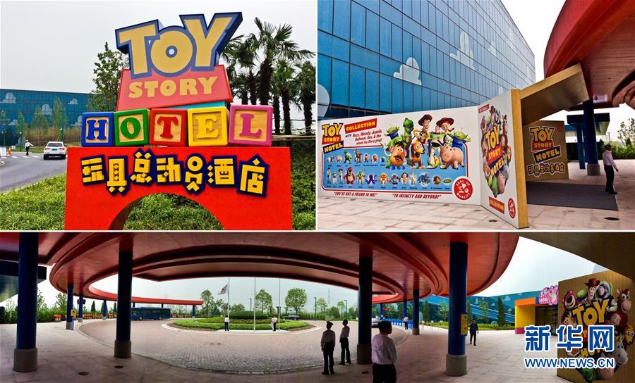 5月15日拍攝的上海迪士尼玩具總動(dòng)員酒店入口標(biāo)志(左上)、酒店大門(mén)(右上)和酒店大堂(下)(拼版圖片)。當(dāng)日,上海迪士尼主題酒店之——玩具總動(dòng)員酒店大堂、廣場(chǎng)、餐廳、度假區(qū)短駁車(chē)等區(qū)域及設(shè)施開(kāi)始內(nèi)部測(cè)試。這家共有800個(gè)房間的主題酒店將于6月中旬正式迎客。新華社發(fā)(鈕一新 攝)