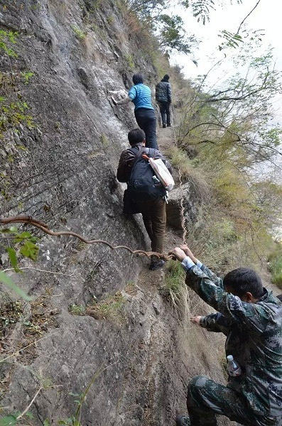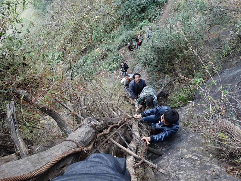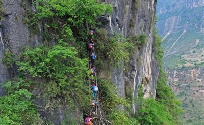 15個(gè)孩子中多數(shù)是女孩,在三個(gè)家長(zhǎng)的保護(hù)下,背著沉沉的書包,大約用了2個(gè)小時(shí),到達(dá)“懸崖村”。村里通向外界,需要順著懸崖斷續(xù)攀爬17條藤梯,其中接近村莊的幾乎垂直的兩條相連的藤梯長(zhǎng)度約100米,沒有藤梯的崖壁才是最危險(xiǎn)的。據(jù)支爾莫鄉(xiāng)黨委書記阿皮幾體講,他知道的在這條路上摔死的人有七八個(gè),有村里的人,也有外來的人,而摔傷的人更多。