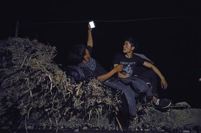 圖為5月12日晚上,村民坐在玉米稈上搜尋手機(jī)信號(hào),村里沒有發(fā)射塔,全靠山下發(fā)射到的微弱信號(hào)接收手機(jī)短信和打電話。9點(diǎn)多鐘,勒爾小學(xué)校長(zhǎng)吉克拉者帶著15個(gè)孩子到山下,其中有陳古吉的5個(gè)孩子,4個(gè)女孩1個(gè)男孩,最小的男孩叫陳木黑,6歲,讀學(xué)前班。爬山開始前,陳木黑被陳古吉系上背包繩。前面由一個(gè)家長(zhǎng)引路,中間一個(gè)家長(zhǎng),陳古吉帶著陳木黑走最后,6歲的陳木黑已經(jīng)在這條路上,上上下下幾十次了。在爬垂直藤梯的時(shí)候,陳古吉會(huì)從后面微微提繩,讓兒子能夠省點(diǎn)力氣,跟上前面的哥哥姐姐。在通過沒有任何附著物的崖壁上的道路時(shí),陳古吉就格外小心,緊抓繩子的手有時(shí)青筋暴起。他說,前些日子,一個(gè)娃滑了一下,幸好崖邊的藤條擋住了,才撿回一條命。