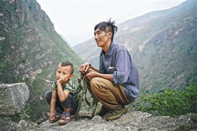 圖為5月14日,在三名家長(zhǎng)的保護(hù)下,15個(gè)孩子從勒爾小學(xué)出發(fā),走崖壁,爬藤梯,踏上回家的路。4月27日,阿土勒爾村的一個(gè)村民摔下了懸崖,村子里的大人對(duì)在山下讀書的孩子更加擔(dān)心起來。阿土勒爾村有15個(gè)6至15歲的孩子在山腳下的勒爾小學(xué)上學(xué),平時(shí)住校,每月月中和月底的周末才回家。每次上下山,家長(zhǎng)們都會(huì)輪流接送。5月14日是家長(zhǎng)接孩子的日子,清晨6點(diǎn)多,30多歲的陳古吉帶著背包繩和另外兩個(gè)家長(zhǎng)一起下山接孩子。村里身手敏捷的年輕人,下山通常需要1小時(shí),上山大約90分鐘,對(duì)于外來的人,通常是這個(gè)時(shí)間的兩倍。