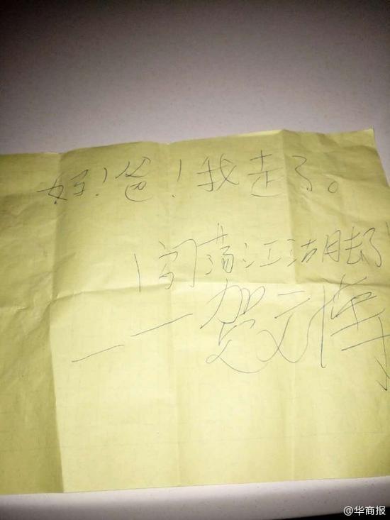 據(jù)賀先生介紹,他是清澗人,在榆林草海則附近打工,5月24日15時(shí)左右,賀先生的妻子回到在草海則租房中看到,家里有被翻動(dòng)的痕跡,剛在家中衣服口袋里的1000元錢不見(jiàn)了,桌子上放了一張紙條,上面是兒子賀文博的字跡:“爸!媽!我走了,闖蕩江湖去了――賀文博”。