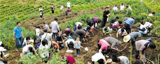 昨天,記者驅(qū)車來到了這個幾乎是磐安縣最東面的偏遠(yuǎn)鄉(xiāng)鎮(zhèn)胡宅,事實(shí)上,后張村就處于磐安和新昌交界的地方。中午時候,這個人口上千的村落幾乎已經(jīng)被各種各樣的車子停滿了,有奔馳越野車,也有面包車和電瓶車,有浙G、浙D、浙A等省內(nèi)牌照的,也有皖N的。這里的山頭傳說是死火山形成,所以土壤肥沃,幾乎整塊都被犁出來,種上莊稼,最多的是茶樹。一眼望去,尋寶的人員估計(jì)有六七百人,有人在挖,也有人是在圍觀。村民說,來來回回,當(dāng)天起碼涌進(jìn)來上千人在尋寶。