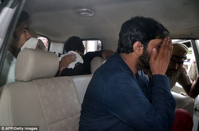 受害女子稱:“我離開學(xué)校,看見了他們,相同的5個(gè)人。我非常害怕。”受害人告訴當(dāng)?shù)匾患译娨暸_(tái),“他們強(qiáng)迫我進(jìn)入車?yán)?,試圖扼死我。他們威脅說要?dú)⑺牢业母赣H和兄弟。”圖為3名涉嫌強(qiáng)奸女子的嫌疑人被捕時(shí),用手遮住臉。