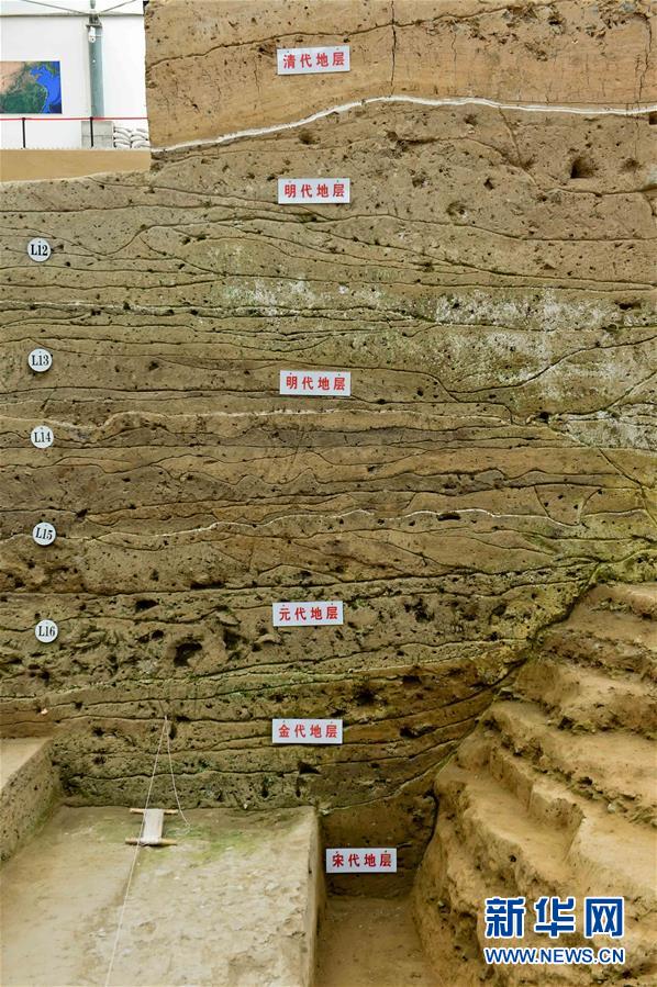 8月25日,在河南省開封市新鄭門遺址發(fā)掘現(xiàn)場,考古人員已揭露出宋代至清代10多層密集疊壓在一起的道路。