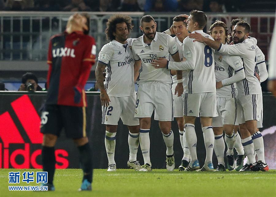 12月18日,皇家馬德里隊球員在世俱杯頒獎儀式上歡呼慶祝。新華社記者馬平攝