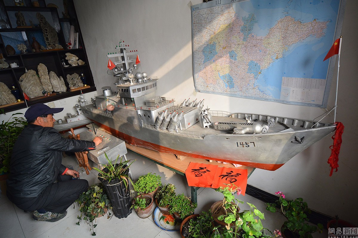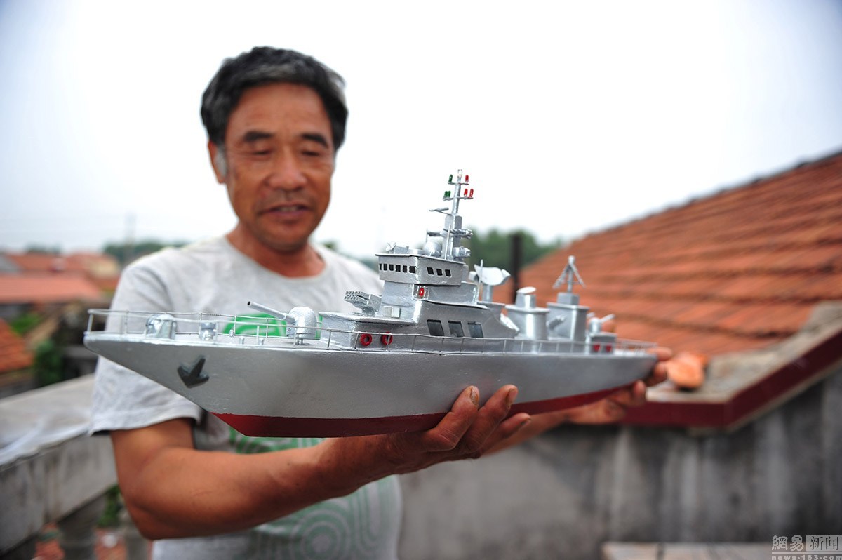 郭長(zhǎng)海,初小文化,當(dāng)過(guò)27年的船長(zhǎng)。2005年,迫于海洋漁業(yè)的枯竭,他將漁船賣掉。但是仍然割舍不了對(duì)大海的依戀之情。平時(shí),他喜歡從電視上了解國(guó)家大事,最愛看軍事頻道,耳濡目染,于是對(duì)軍艦產(chǎn)生了濃厚的興趣。農(nóng)閑的時(shí)候,郭長(zhǎng)海便琢磨起了艦艇模型的制作。