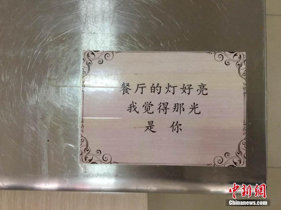 記者16日在西北政法大學雁塔校區(qū)綜合餐廳里看到,這些富有創(chuàng)意的三行情書貼于餐桌的右下角,語句詼諧幽默,浪漫十足,不時有買飯路過的學生駐足觀看,還有人拿出手機拍照。不少慕名而來的外校生專程前來蹭飯,體會“樸素的食堂愛情故事”。燕武 阿琳娜 攝影報道