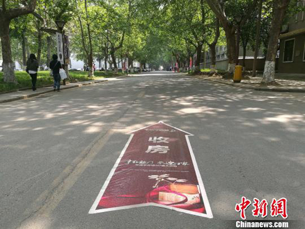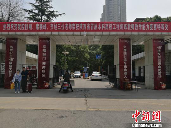 校園內貼有收房指示路標。記者4月27日在西安建筑科技大學華清學院看到,華清學府城與該校緊鄰,中間有一道門可以進出。樓盤交房廣告標語張貼于學校大門的門柱上,寫有“交房臨時停車由此進入”、“46#樓交房現(xiàn)場由此前行”、“熱烈祝賀46#樓盛大交房”等標示。