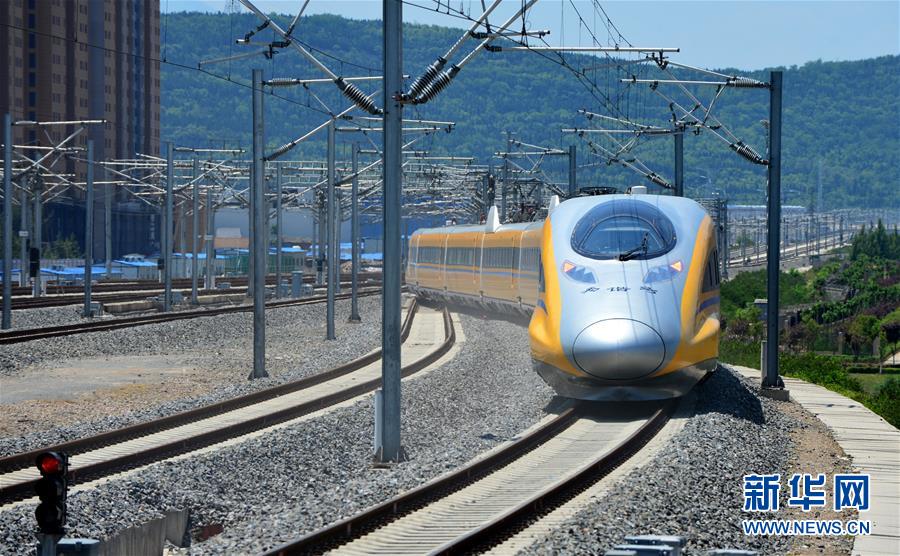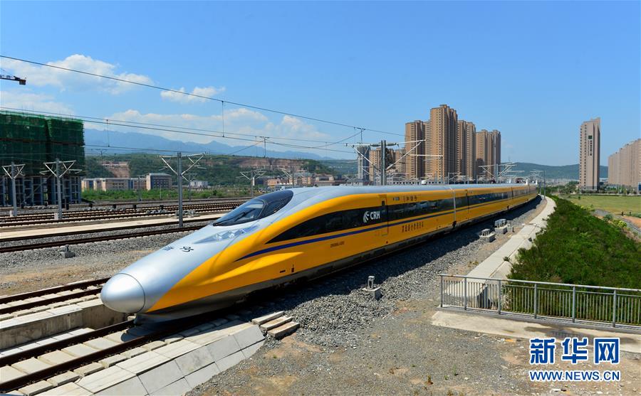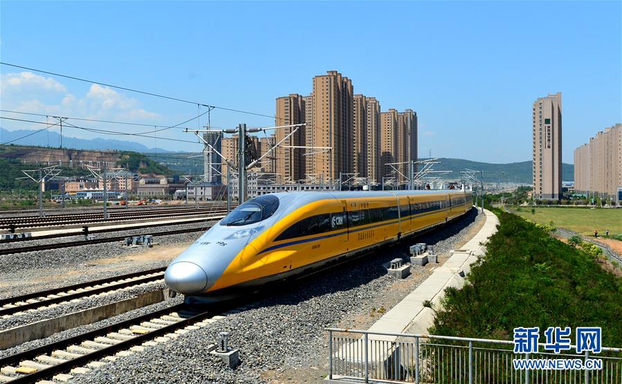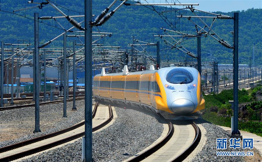 在陜西寶雞,一列高速綜合檢測列車在寶蘭高鐵上行駛(5月16日攝)。