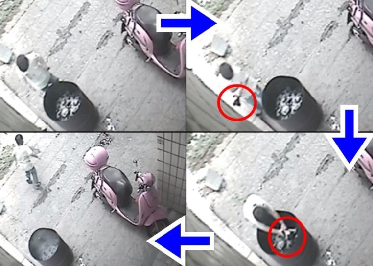 “然后我們以為那個小狗,那個桶那么高,它怎么能跳進去。然后我們就調(diào)監(jiān)控,發(fā)現(xiàn)是鄰居家小孩做的?!眻D為男童抓起小狗將其扔進火盆。