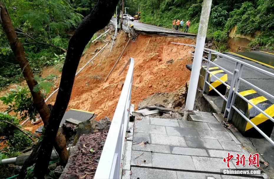 7月18日,深圳普降大暴雨局部特大暴雨,致部分路段嚴(yán)重積水、山體滑坡道路中斷、交通擁堵等險情。深圳鹽田區(qū)盤山公路恩上路段出現(xiàn)滑坡,無人員、車輛被困;深鹽二通道下沙頭角出口匝道中間因山水傾瀉,道路中斷,交警已經(jīng)實施了交通管制。當(dāng)?shù)貧庀蟛块T先后發(fā)布了雷電、暴雨黃色、暴雨橙色和暴雨紅色分區(qū)預(yù)警信號。圖為深圳鹽田區(qū)盤山公路恩上路段出現(xiàn)滑坡道路中斷。中新社記者 鐘新 攝