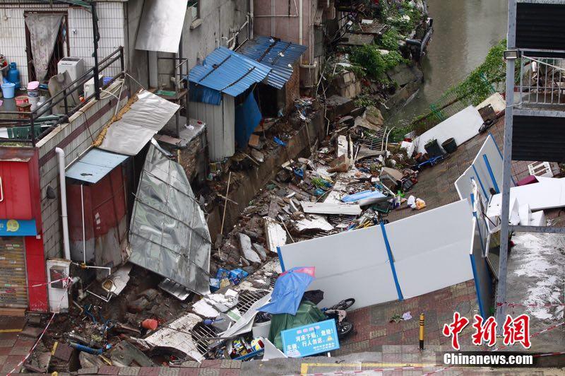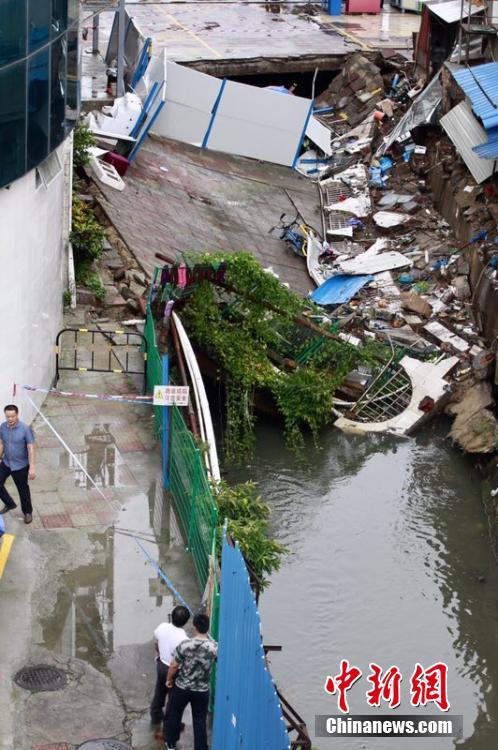 7月18日,深圳普降大暴雨局部特大暴雨,致部分路段嚴(yán)重積水、山體滑坡道路中斷、交通擁堵等險情。深圳鹽田區(qū)盤山公路恩上路段出現(xiàn)滑坡,無人員、車輛被困;深鹽二通道下沙頭角出口匝道中間因山水傾瀉,道路中斷,交警已經(jīng)實施了交通管制。當(dāng)?shù)貧庀蟛块T先后發(fā)布了雷電、暴雨黃色、暴雨橙色和暴雨紅色分區(qū)預(yù)警信號。圖為深圳寶安區(qū)西鄉(xiāng)永安商業(yè)城門前區(qū)域坍塌,長約15米、寬約6米的塌陷。中新社記者 鐘新 攝