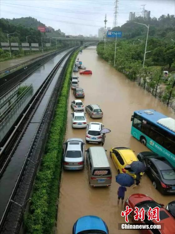 7月18日,深圳普降大暴雨局部特大暴雨,致部分路段嚴(yán)重積水、山體滑坡道路中斷、交通擁堵等險情。深圳鹽田區(qū)盤山公路恩上路段出現(xiàn)滑坡,無人員、車輛被困;深鹽二通道下沙頭角出口匝道中間因山水傾瀉,道路中斷,交警已經(jīng)實施了交通管制。當(dāng)?shù)貧庀蟛块T先后發(fā)布了雷電、暴雨黃色、暴雨橙色和暴雨紅色分區(qū)預(yù)警信號。圖為深圳龍崗金銀坑路段嚴(yán)重積水。中新社記者 鐘欣 攝