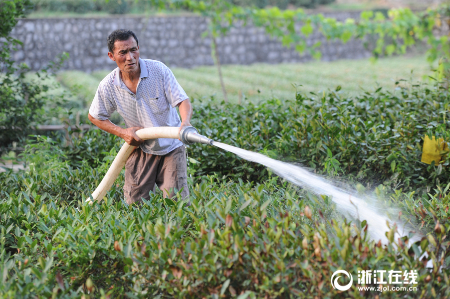 連日來,杭城持續(xù)高溫?zé)o雨,西湖龍井茶一級(jí)保護(hù)區(qū)的梅家塢村、梵村、雙峰村等地茶樹“受傷”不輕。茶農(nóng)們積極行動(dòng)起來,為茶樹蓋上防曬網(wǎng),同時(shí)采取澆水的方式抗旱保茶。(浙江在線記者 吳元峰 董旭明 攝)
